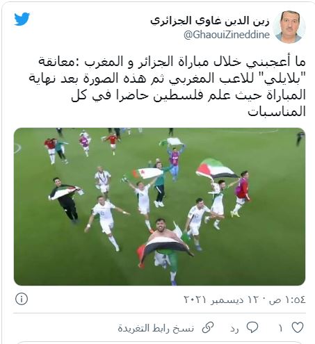 وعند انتهاء المبارات التي انتهت بفوز المنتخب الجزائري على نظيره المغربي بركلات الترجيح 5-3 ليل امس السبت، والتأهل إلى المربع الذهبي من كأس العرب لكرة القدم المقامة في قطر، إذ طلب الظهير الأيمن الجزائري "حسين بن عيادة"، علم فلسطين من مشجع رفعه على المدرجات، بينما سار الشاب، حسام الدين مريزيق، على خطاه، في حين وضع آخر الكوفية على أكتافه، الأمر الذي ذكّر عشاق المنتخب الجزائري بتصرّف نجمهم الأول، رياض محرز، عندما رفع علم فلسطين احتفالاً بتحقيق الدوري الإنكليزي الممتاز، مع فريقه مانشستر سيتي، الموسم الماضي.
