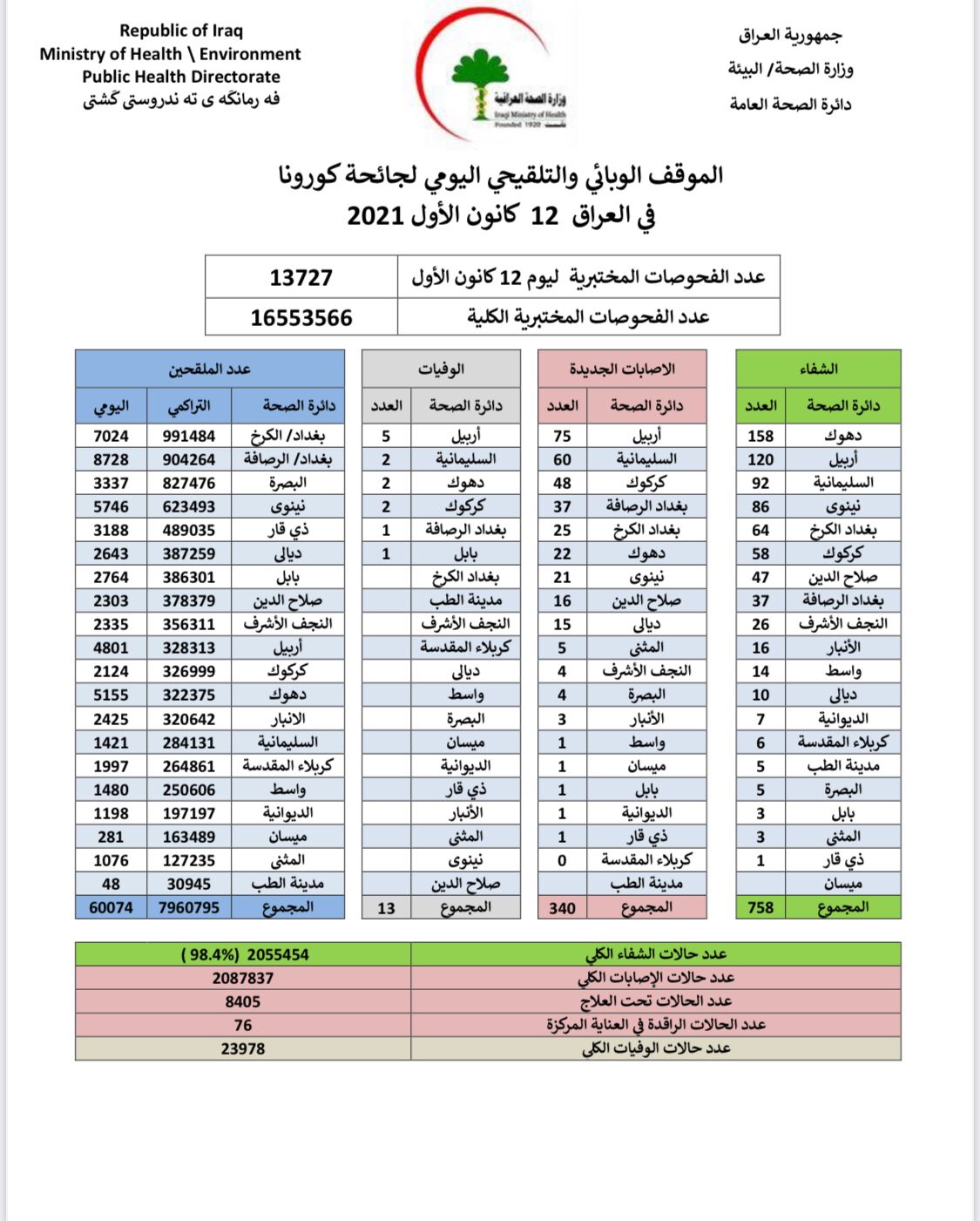 وقالت الوزارة في بيان ، إنها "سجلت 340 إصابة جديدة، مقابل تماثل 758 حالة للشفاء، و13 وفاة بالفيروس".