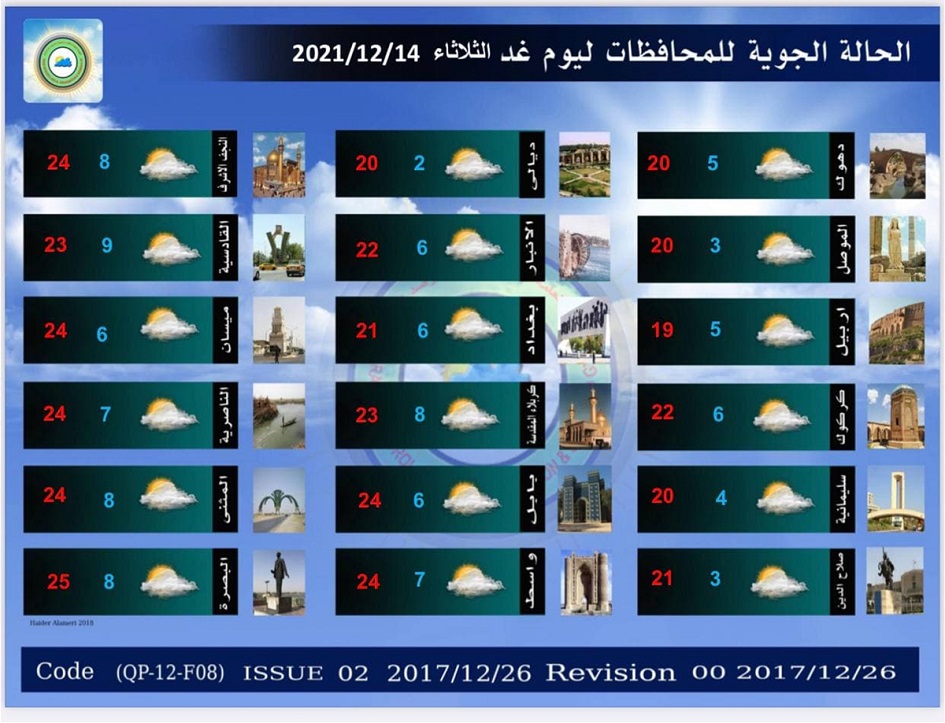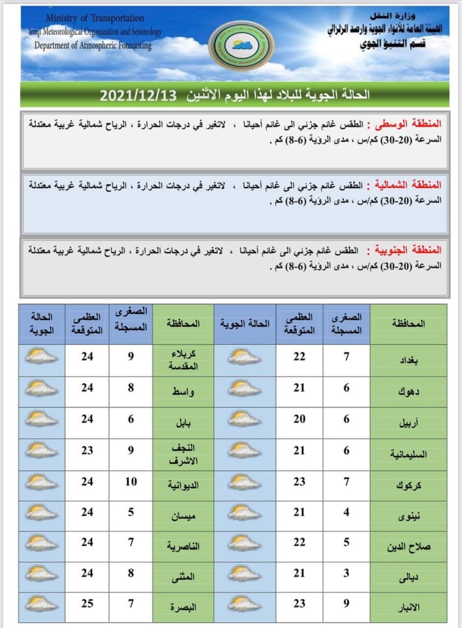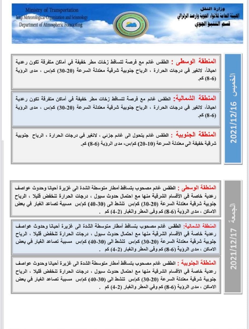 وذكرت الهيئة في بيان ورد لـ السومرية نيوز، إنه "من المتوقع تساقط أمطار وحدوث عواصف رعدية بدءاً من الخميس المقبل". وأدناه جداول توضح حالة الطقس بالتفصيل للايام الاربعة المقبلة: