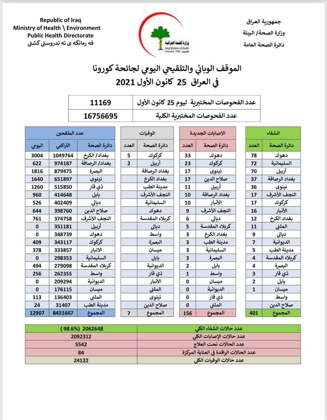 وقالت الوزارة في بيان ، إنها "سجلت 156 إصابة جديدة، مقابل تماثل 401 حالة للشفاء، وتسجيل 7 حالات وفاة بالفيروس".