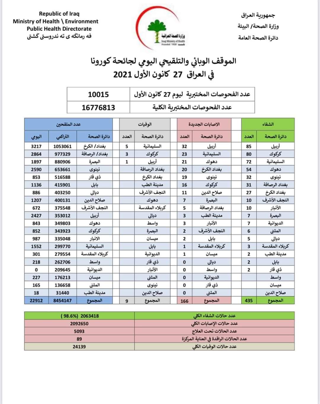 وقالت الوزارة في بيان ، إن كوادرها سجلت "166 إصابة جديدة، فضلاً عن تماثل 435 حالة جديدة للشفاء، وتسجيل 9 حالة وفاة بالفيروس".