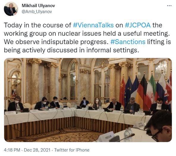 ونشر أوليانوف تغريدة اليوم الثلاثاء، اعلن فيها عقد "اجتماع بناء" لفريق العمل المعني بالقضايا النووية، على امتداد المفاوضات بين ايران ومجموعة 4+1'>ايران ومجموعة 4+1 بفيينا.