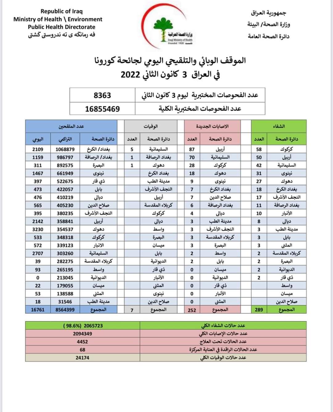 وقالت الوزارة في بيان، إن "كوادرها سجلت 252 إصابة جديدة، مقابل تماثل 289 حالة للشفاء، و 7 وفيات بالفيروس". وأشارت إلى تلقي 16761 شخصاً للقاح كورونا في يوم واحد.