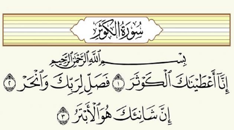 إِنَّا أَعْطَيْنَاكَ الْكَوْثَرَ ﴿1﴾ فَصَلِّ لِرَبِّكَ وَانْحَرْ ﴿2﴾ إِنَّ شَانِئَكَ هُوَ الْأَبْتَرُ ﴿3﴾
