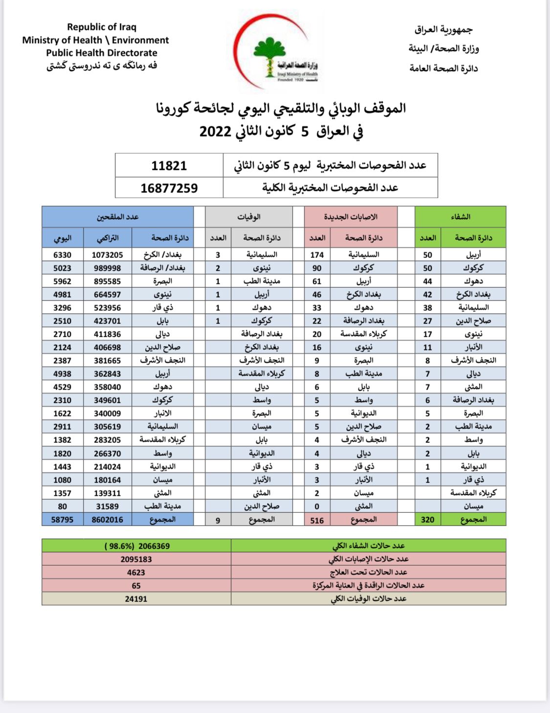 وقالت الوزارة في بيان ، إنها "سجلت 516 حالة إصابة جديدة، مقابل تماثل 320 حالة للشفاء، و 9 وفيات بالفيروس".