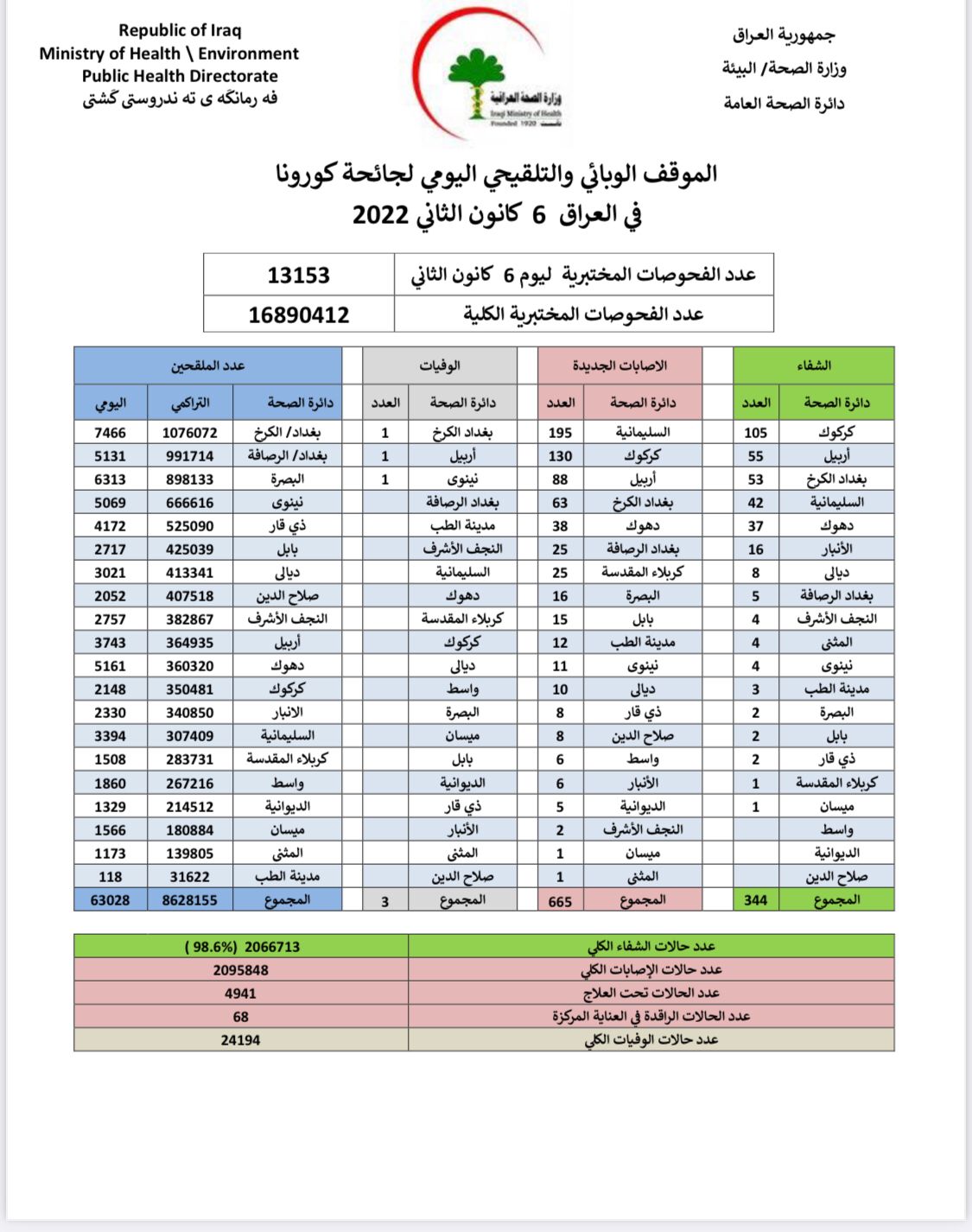 وذكرت الوزارة، في بيان ، أنها "سجلت 656 إصابة جديدة بفيروس كورونا، وتماثل 334 شخصاً للشفاء". وأضاف البيان، أن "حالات الوفاة الجديدة بكورونا بلغت 3 في عموم محافظات البلاد"، لافتاً إلى أن "الاشخاص الذين تلقوا اللقاح خلال 24 ساعة بلغ عددهم 63028".