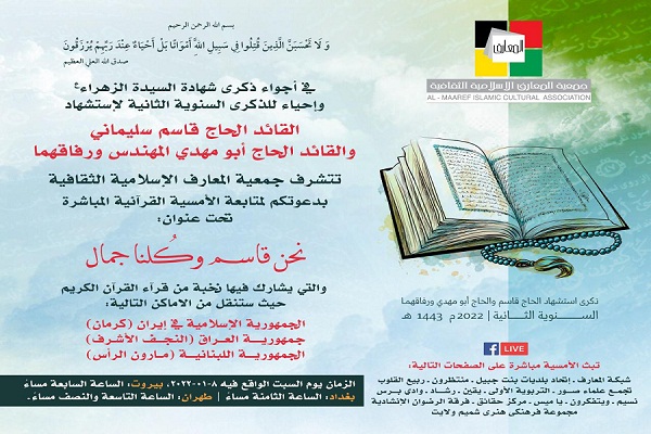 وأعلنت جمعية المعارف الإسلامية الثقافية في لبنان عن إحياء أمسية قرآنية، وذلك في أجواء ذكرى استشهاد السيدة الزهراء(ع)، واحياء الذكرى السنوية الثانية لإستشهاد القائد الحاج قاسم سليماني والقائد الحاج ابو مهدي المهندس ورفاقهما. وهذه الأمسية تحت عنوان "نحن قاسم وكلنا جمال"، وسيشارك فيها نخبة من قراء القرآن الكريم من الدول الثلاث (إيران،لبنان،العراق) وستنقل يوم السبت الموافق 8 يناير / كانون الثاني 2022 بالأوقات التالية "الساعة السابعة مساء بتوقيت بيروت"، "الثامنة مساء بتوقيت بغداد"، و"الساعة التاسعة والنصف مساء بتوقيت طهران"، وستبث الأمسية على المواقع الفيسبوكية التالية: شبكة المعارف ـ اتحاد بلديات جبيل ـ منتظرون ـ ربيع القلوب ـ تجمع علماء صور ـ التربوية الأولى ـ يقين ـ رشاد ـ وادي برس نسيم ـ ويتفكرون- يا ميس- مركز الحقائق- فرقة الرضوان الإنشادية ـ مجموعة "شميم الولاية" الثقافية والفنية.