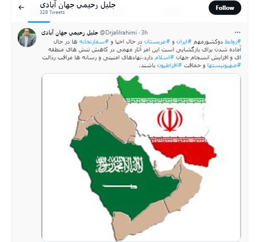 وقال عضو لجنة الأمن القومي والسياسة الخارجية في البرلمان الإيراني، جليل رحيمي جهان أبادي، عبر حسابه على "تويتر"، إن "العلاقات بين إيران والسعودية يتم إحياؤها وإن السفارتين تستعدان لإعادة فتحهما".