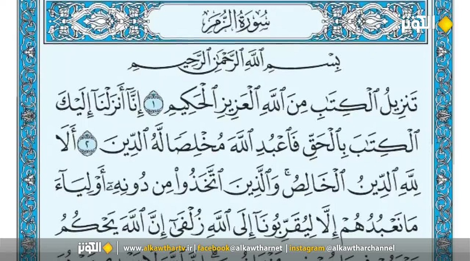 خَلَقَ السَّمَاوَاتِ وَالأَرْضَ بِالْحَقِّ يُكَوِّرُ اللَّيْلَ عَلَى النَّهَارِ وَيُكَوِّرُ النَّهَارَ عَلَى اللَّيْلِ وَسَخَّرَ الشَّمْسَ وَالْقَمَرَ كُلٌّ يَجْرِي لأَجَلٍ مُسَمًّى أَلا هُوَ الْعَزِيزُ الْغَفَّارُ