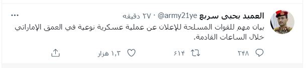 من جهته أعلن متحدث القوات المسلحة العميد يحيى سريع في تغريدة على تويتر:، أنه سيتم خلال الساعات القادمة، الكشف عن عملية عسكرية نوعية في العمق الإماراتي.