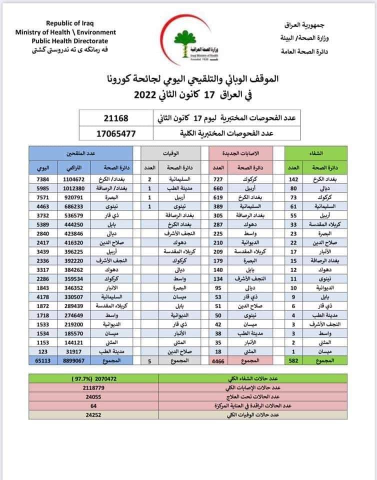 وقالت الوزارة في بيان ، إنه تم تسجيل 4466 إصابة جديدة، مقابل تماثل 582 حالة للشفاء، مع تسجيل 5 حالات وفاة بالفيروس. وأشارت إلى تلقي 65113 شخصاً للقاح كورونا في يوم واحد.