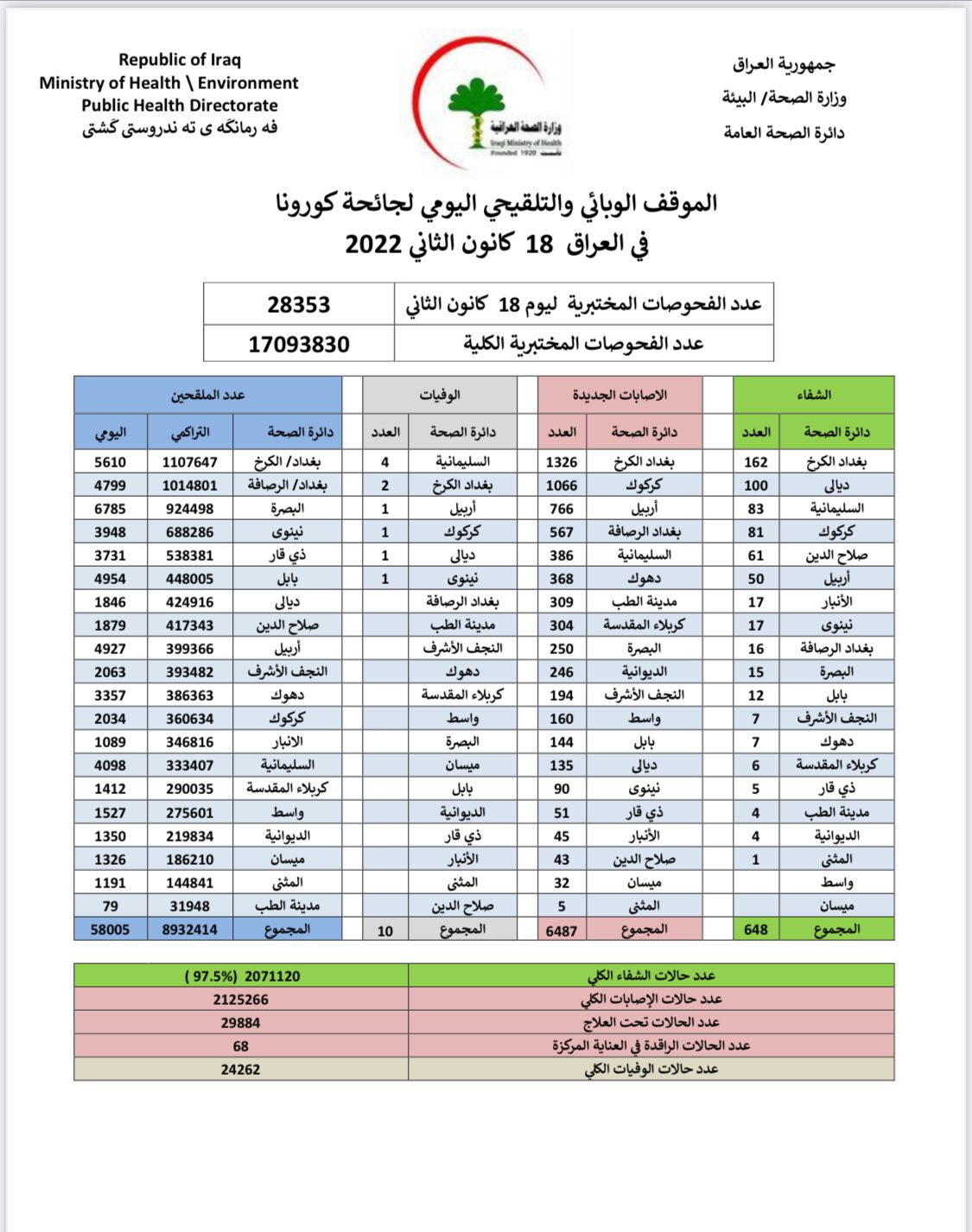 وقالت الوزارة في بيان، إنها "سجلت 6487 إصابة جديدة، مقابل تماثل 648 حالة للشفاء، و 10 حالات وفاة بالفيروس". وأشارت إلى تلقي 58005 أشخاص للقاح كورونا في يوم واحد.