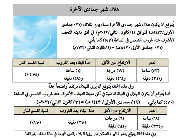 يُتوقع ان يكون هلال شهرجمادي الآخرة مساء يوم الثلاثاء30/ جمادي الاول الموافق (1/كانون الثاني 2022) في أفق مدينة النجف الأشرف عند غروب الشمس في الساعة (5:11) كما يأتي