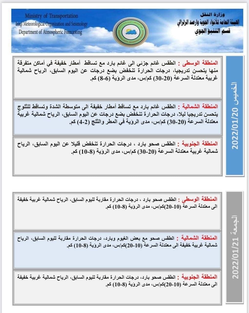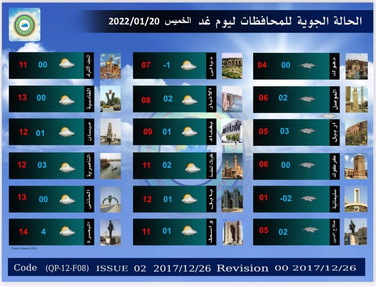 وذكرت الهيئة في بيان انه "من المتوقع ان تشهد البلاد ارتفاعاً في درجات الحرارة بدءاً من الأسبوع المقبل". وأدناه جداول توضح حالة الطقس بالتفصيل للايام المقبلة.
