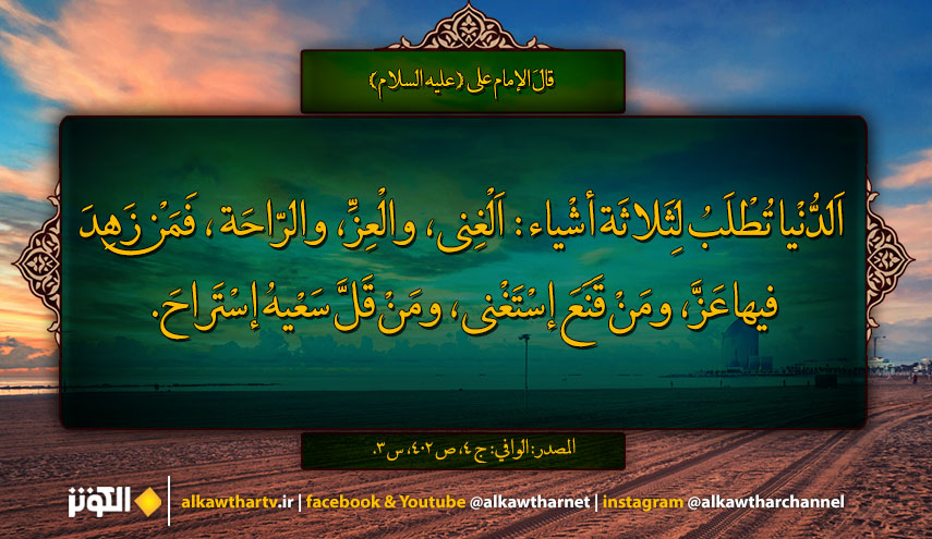 اَلدُّنْیا تُطلَبُ لِثَلاثَةِ أشْیاء: اَلْغِنی، وَ الْعِزِّ، وَ الرّاحَةِ، فَمَنْ زَهِدَ فیها عَزَّ، وَ مَنْ قَنَعَ إسْتَغْنی، وَ مَنْ قَلَّ سَعْیُهُ إسْتَراحَ.