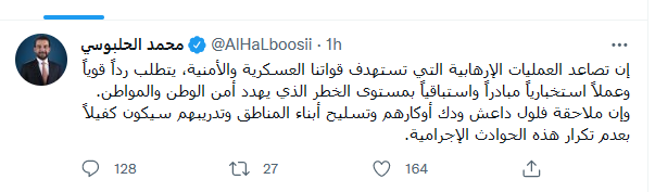 وقال الحلبوسي إن "تصاعد العمليات الإرهابية التي تستهدف قواتنا العسكرية والأمنية، يتطلب رداً قوياً وعملاً استخبارياً مبادراً واستباقياً بمستوى الخطر الذي يهدد أمن الوطن والمواطن".