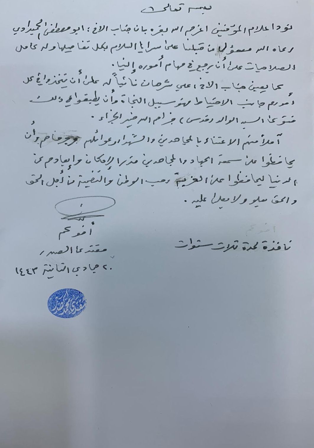 وبحسب وثيقة للصدر، فقد تم تعيين "أبو مصطفى الحميداوي" مسؤولا على سرايا السلام، و "علي سرحان" نائباً له. أدناه الوثيقة: