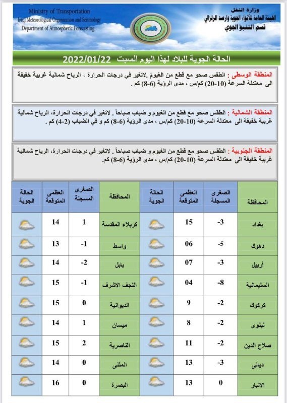 الهيئة قالت في بيان أن "الحالة الجوية للبلاد لهذا اليوم السبت في المنطقة الوسطى الطقس صحو مع قطع من الغيوم، أما المنطقتي الشمالية والجنوبية فالطقس صحو مع قطع من الغيوم و ضباب، ولا تغير في درجات الحرارة في عموم مناطق البلاد".