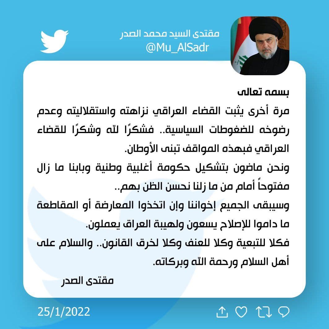 وكتب الصدر في تغريدة عبر تويتر، "مرة أخرى يثبت القضاء العراقي نزاهته واستقلاليته وعدم رضوخه للضغوطات السياسية. (على حد تعبيره)، فشكرا لله وشكرا للقضاء العراقي فبهذه المواقف تبنى الأوطان". وتابع: "نحن ماضون بتشكيل حكومة أغلبية وطنية وبابنا ما زال مفتوحا أمام من ما زلنا نحسن الظن بهم". وارف الصدر: "سيبقى الجميع إخواننا وإن اتخذوا المعارضة أو المقاطعة ما داموا للإصلاح يسعون ولهيبة العراق يعملون". وختم الصدر: "كلا للتبعية وكلا للعنف وكلا لخرق القانون.. والسلام على أهل السلام ورحمة الله وبركاته".