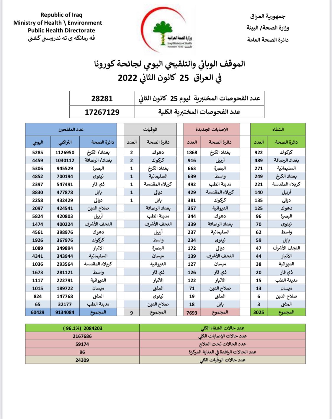وقالت الوزارة في بيان ، إنها "سجلت 7693 حالة إصابة، و 3025 حالة شفاء، و 9 وفيات بالفيروس". وأشارت إلى تلقي 60429 شخصاً للقاح كورونا في عموم العراق.