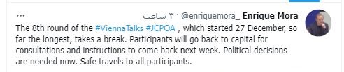 وفي هذا السياق كتب مبعوث الاتحاد الأوروبي إلى محادثات فيينا ، إنريكي مورا ، تغريدة على تويتر في وقت سابق:  إن الجولة الثامنة من المحادثات ، التي بدأت في 27 ديسمبر والتي تعد من أطول جولات المفاوضات لحد الآن ، دخلت فترة استراحة.