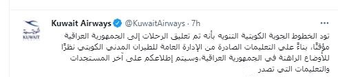 وأضافت الشركة أن التعليق جاء بناءً على التعليمات الصادرة من الإدارة العامة للطيران المدني، وذلك «نظرًا للأوضاع الراهنة في الجمهورية العراقية».