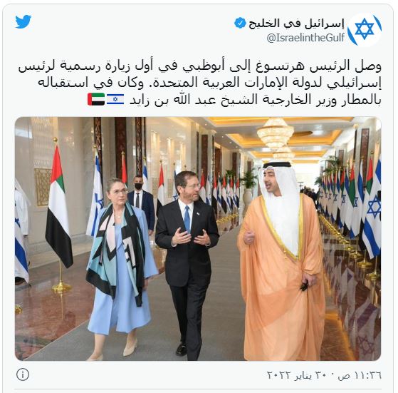 وتأتي زيارة "هرتسوغ" بعد أن قام رئيس وزراء الكيان الإسرائيلي "نفتالي بينيت" بأول زيارة رسمية له إلى الإمارات في ديسمبر الماضي.