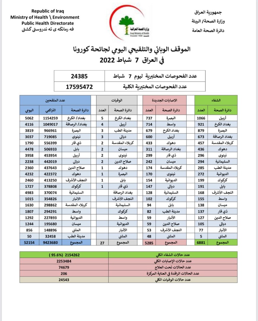 وأشارت إلى تلقي 52154 شخصاً للقاح الجائحة في عموم البلاد، خلال يوم واحد.