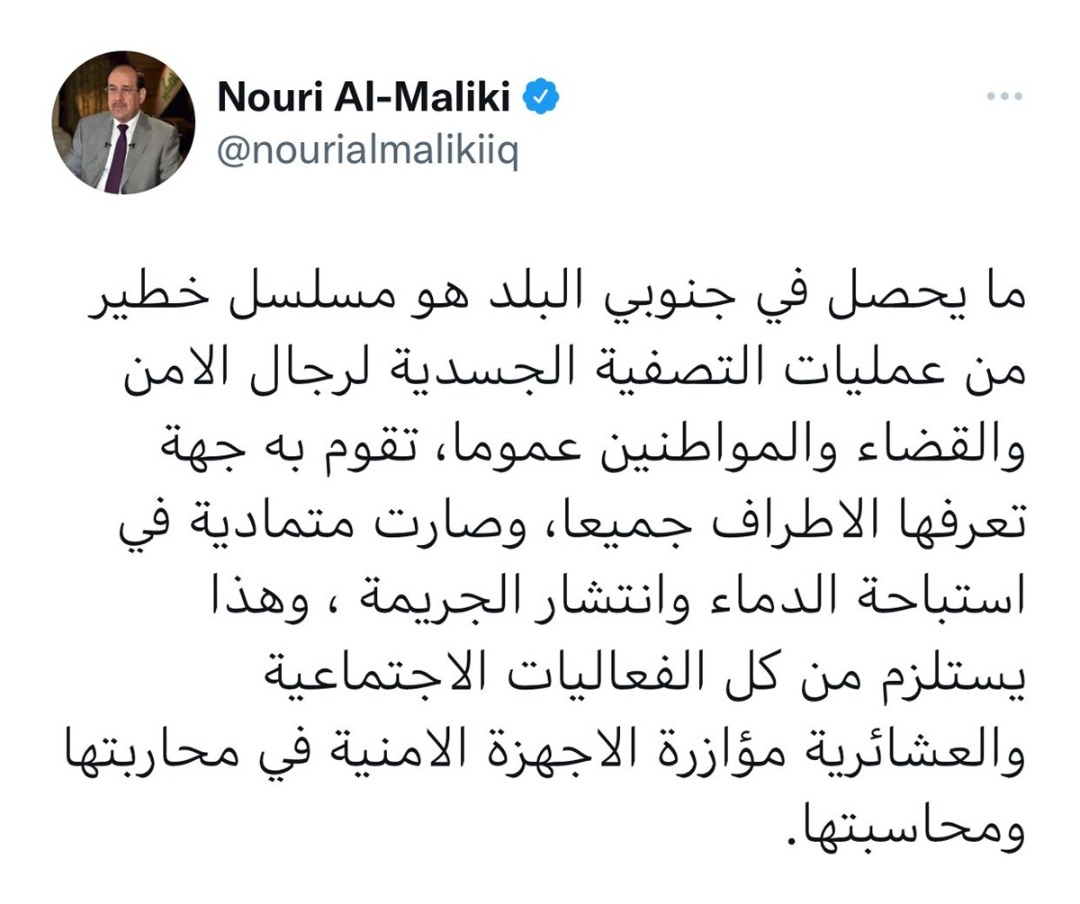 وقال المالكي في تغريدة عبر تويتر، إن "ما يحصل في جنوبي البلد هو مسلسل خطير من عمليات التصفية الجسدية لرجال الامن والقضاء والمواطنين عموما، تقوم به جهة تعرفها الاطراف جميعا، وصارت متمادية في استباحة الدماء وانتشار الجريمة".