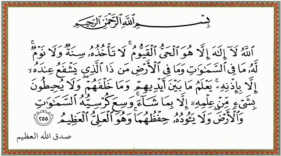 ﴿ اللَّهُ لَا إِلَٰهَ إِلَّا هُوَ الْحَيُّ الْقَيُّومُ لَا تَأْخُذُهُ سِنَةٌ وَلَا نَوْمٌ لَهُ مَا فِي السَّمَاوَاتِ وَمَا فِي الْأَرْضِ مَنْ ذَا الَّذِي يَشْفَعُ عِنْدَهُ إِلَّا بِإِذْنِهِ يَعْلَمُ مَا بَيْنَ أَيْدِيهِمْ وَمَا خَلْفَهُمْ وَلَا يُحِيطُونَ بِشَيْءٍ مِنْ عِلْمِهِ إِلَّا بِمَا شَاءَ وَسِعَ كُرْسِيُّهُ السَّمَاوَاتِ وَالْأَرْضَ وَلَا يَئُودُهُ حِفْظُهُمَا وَهُوَ الْعَلِيُّ الْعَظِيمُ ﴾ 1.