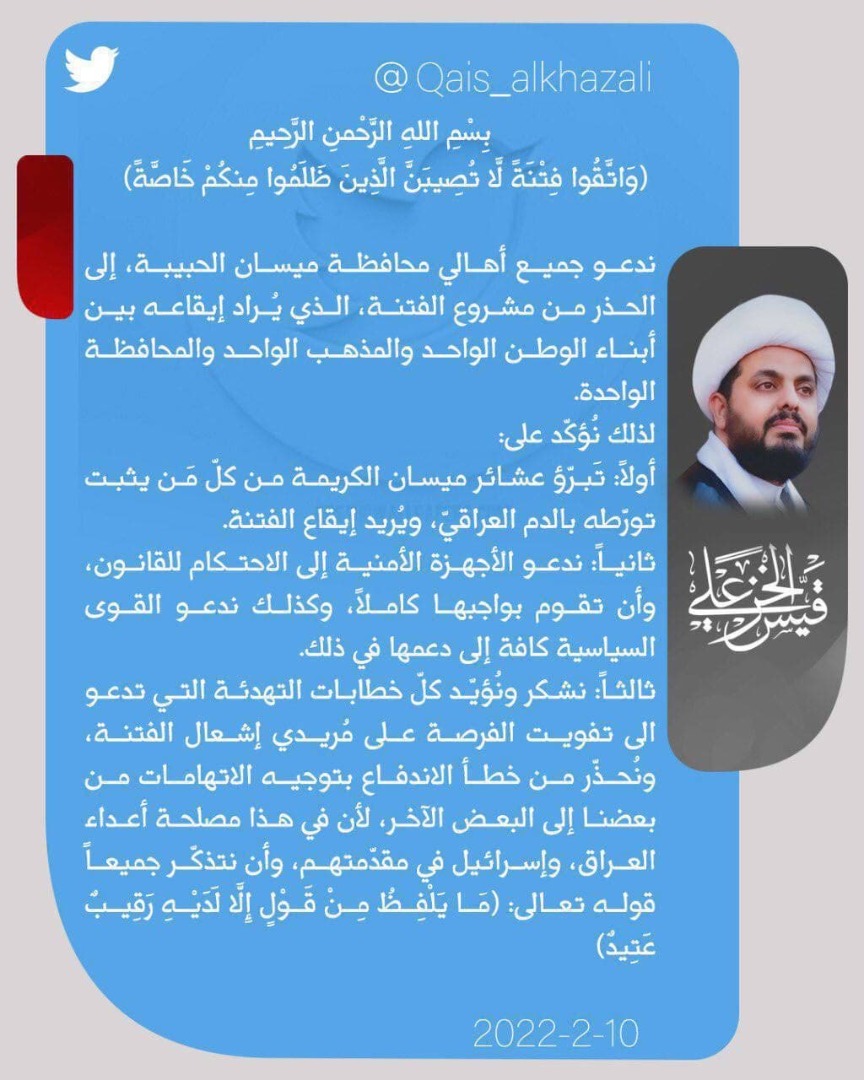 ودعا الخزعلي، في بيانه، أهالي ميسان، للحذر من مشروع الفتنة، الذي يُراد إيقاعه بين أبناء الوطن الواحد والمذهب الواحد والمحافظة الواحدة.