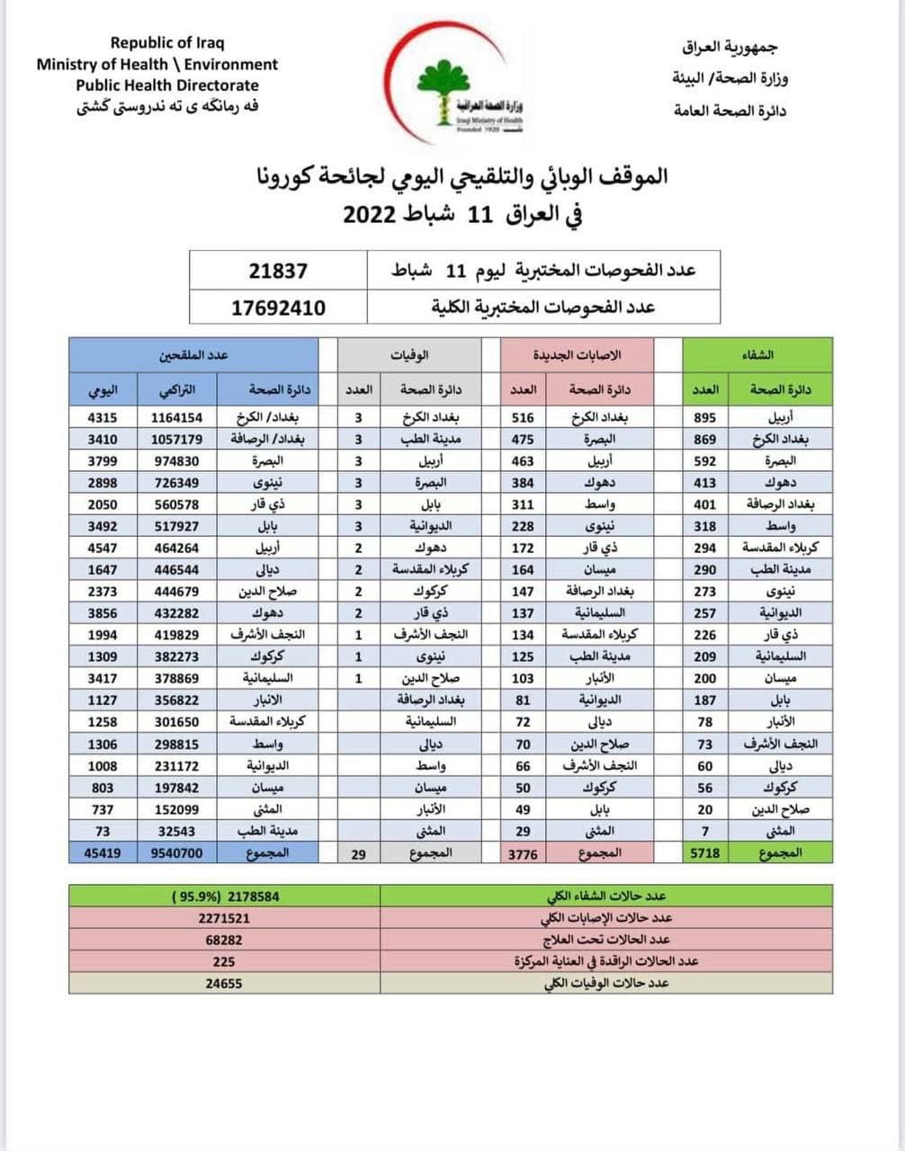 وأضاف، أن "المختبرات الصحية سجلت 29 حالة وفاة جديدة بكورونا، في حين تلقى 45419 شخصاً للقاح كورونا في يوم واحد".