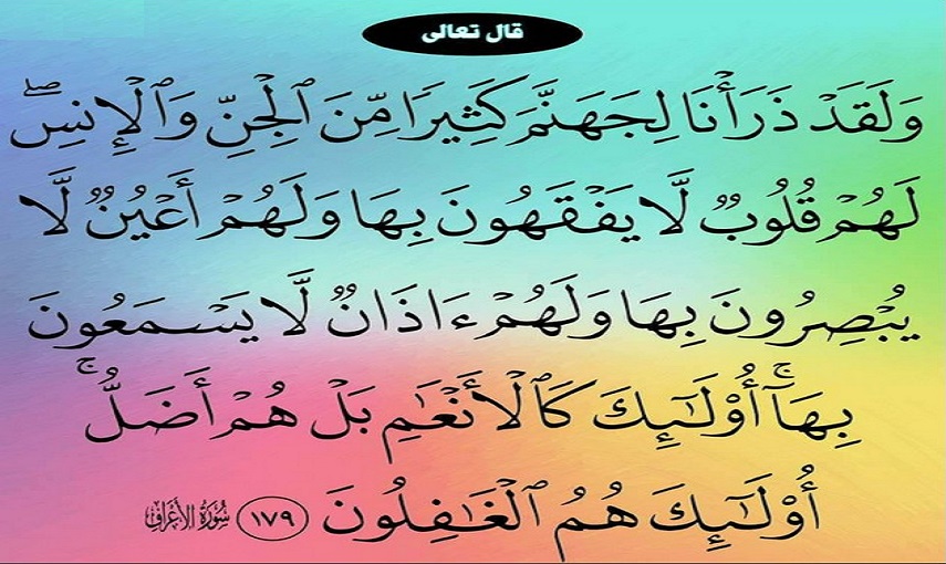 قال الله تعالى في كتابه المجيد: {َلَقَدْ ذَرَأْنَا لِجَهَنَّمَ كَثِيراً مِّنَ الجِنِّ وَالْانسِ لَهُمْ قُلُوبٌ لَّايَفْقَهُونَ بِهَا وَلَهُمْ اعيُنٌ لَّا يُبْصِرُونَ بِهَا وَلَهُمْ آذَانٌ لَّايَسمَعُونَ بِهَا اولَئِكَ كَالأَنعَامِ بَل هُم اضَلُّ أُولَئِكَ هُمُ الغَافِلُونَ} (الأعراف/ 179 )