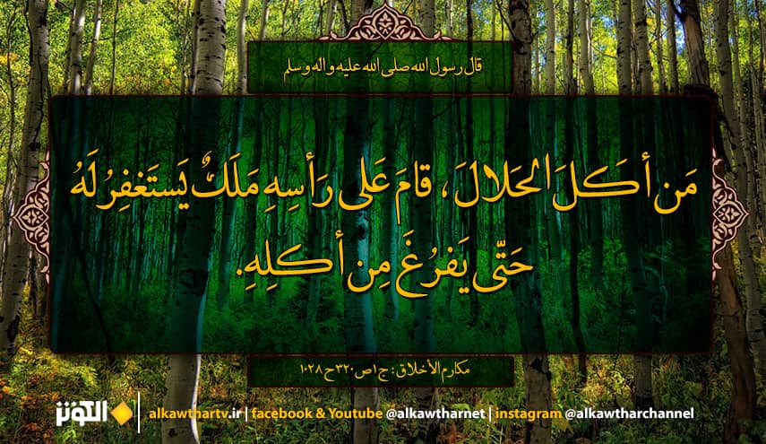 مَنْ أَكَلَ اَلْحَلاَلَ قَامَ عَلَى رَأْسِهِ مَلَكٌ يَسْتَغْفِرُ لَهُ حَتَّى يَفْرُغَ مِنْ أَكْلِهِ.