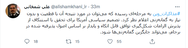 وفي تغريدة له اليوم الاثنين قال شمخاني "ان مفاوضات فيينا وصلت إلى مرحلة يمكن فيها التعليق على النتيجة بيقين ودون الحاجة إلى تكهنات ، القرار السياسي الأمريكي للتحقق او الاستنكاف عن قبول الزامات تشكيل اتفاق دائم وذو مصداقية على أساس المبادئ المقبولة في الاتفاق النووي يمكن ان يحل محل التكهنات.