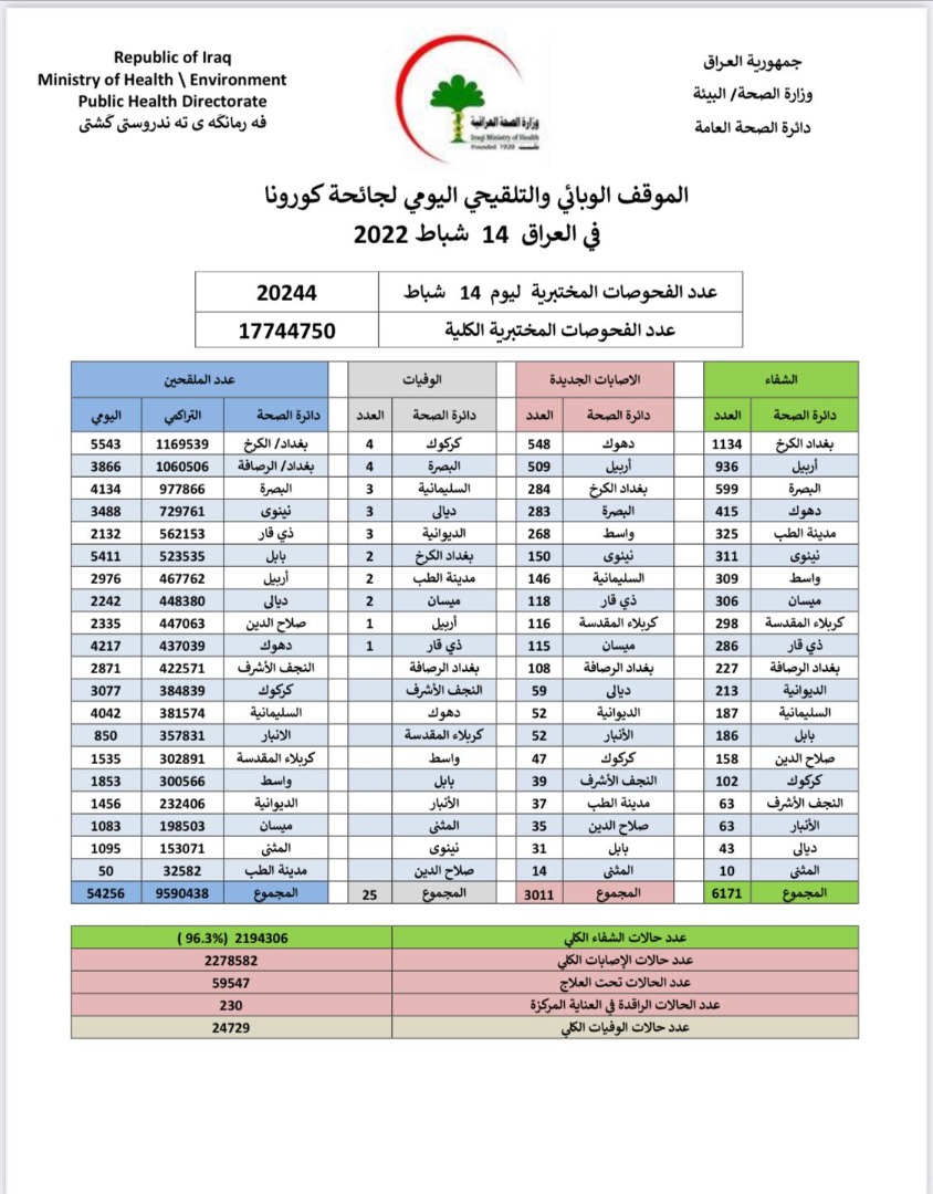 وقالت الوزارة في بيان ، إنها "سجلت 3011 حالة إصابة جديدة، مقابل تماثل 6171 حالة للشفاء، و 25 حالة وفاة بالفيروس".