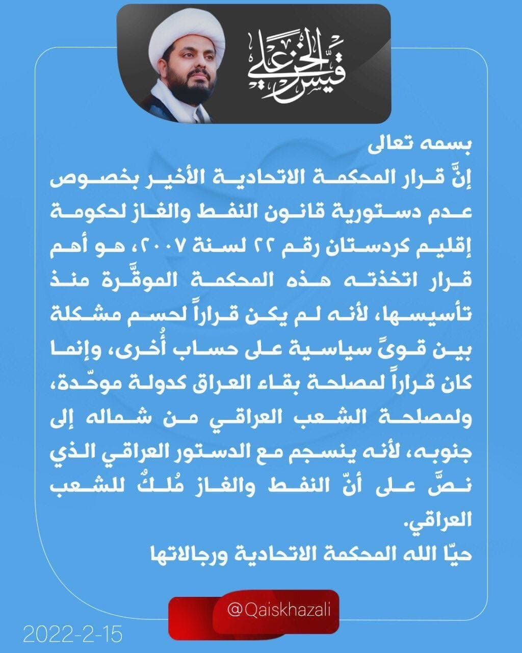 وقال الخزعلي في تغريدة له ان “قرار المحكمة الاتحادية بشأن عدم دستورية قانون النفط والغاز لحكومة إقليم كردستان أهم قرار اتخذته منذ تأسيسها”.