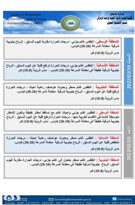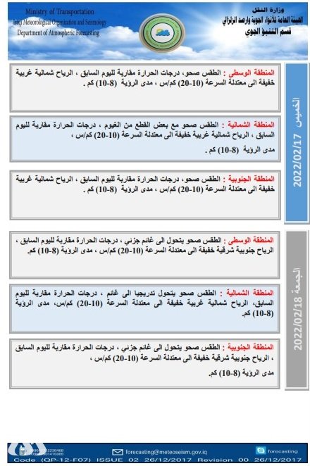 ولفت الى أن " طقس يوم الاحد المقبل في المنطقة الوسطى سيكون غائماً جزئياً واحياناً غائماً مع تساقط امطار خفيفة وتكون الامطار متوسطة الشدة في الاقسام الغربية منها ،ودرجات الحرارة ترتفع قليلاً عن اليوم السابق ، بينما سيكون طقس المنطقة الشمالية غائماً ممطراً وحدوث عواصف رعدية احياناً ، ودرجات الحرارة ستنخفض قليلاً عن اليوم السابق ، فيما سيكون في المنطقة الجنوبية غائماً ممطراً يتحول الى غائم جزئي ،أما درجات الحرارة فستكون مقاربة لليوم السابق ".