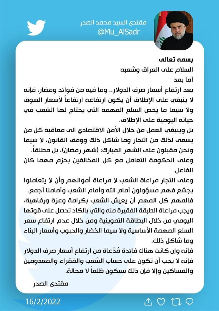وقال السيد الصدر في تغريدة، "بعد ارتفاع أسعار صرف الدولار.. وما فيه من فوائد ومضار، فإنه لا ينبغي على الإطلاق أن يكون ارتفاعه ارتفاع أسعار السوق ولا سيما ما يخص السلع المهمة التي يحتاج لها الشعب في حياته اليومية على الإطلاق"، مبيناً أنه "ينبغي العمل من خلال الأمن الاقتصادي الى معاقبة كل من يسعى لذلك من التجار وما شاكل ذلك ووفق القانون، لا سيما الا ونحن مقبلون على الشهر المبارك: (شهر رمضان)، بل مطلقا وعلى الحكومة التعامل مع كل المخالفين بحزم مهما كان الفاعل".