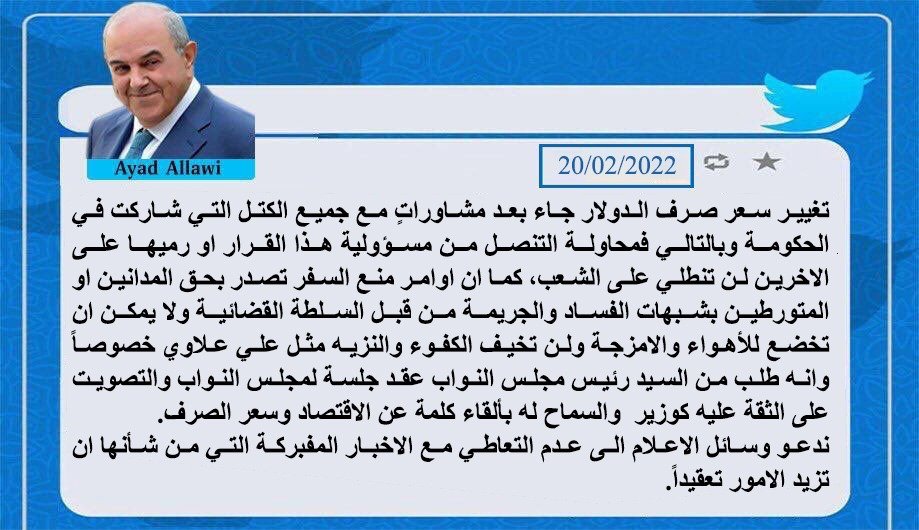 وقال علاوي في تغريدة عبر "تويتر"، إن "تغيير سعر صرف الدولار جاء بعد مشاوراتٍ مع جميع الكتل التي شاركت في الحكومة وبالتالي فمحاولة التنصل من مسؤولية هذا القرار او رميها على الاخرين لن تنطلي على الشعب".