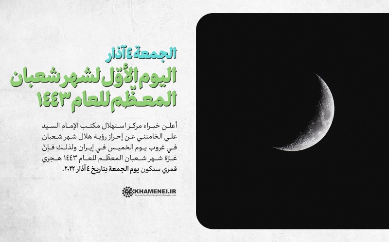 أعلن خبراء مركز استهلال مكتب الإمام السيد علي الخامنئي عن إحراز رؤية هلال شهر شعبان في غروب يوم الخميس في إيران ولذلك فإنّ غرّة شهر شعبان المعظّم للعام 1443 هجري قمري ستكون يوم الجمعة بتاريخ 4 آذار 2022.