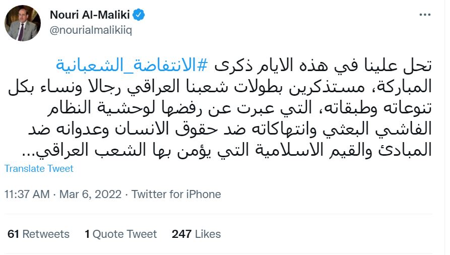 وقال المالكي في تدوينتين على تويتر "تحل علينا في هذه الايام ذكرى الانتفاضة الشعبانية المباركة، مستذكرين بطولات شعبنا العراقي رجالا ونساء بكل تنوعاته وطبقاته، التي عبرت عن رفضها لوحشية النظام الفاشي البعثي وانتهاكاته ضد حقوق الانسان وعدوانه ضد المبادئ والقيم الاسلامية التي يؤمن بها الشعب العراقي".
