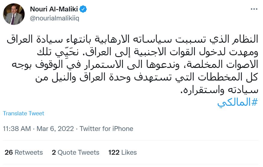 وفي تغريدة ثانية تابع قائلا: "النظام الذي تسببت سياساته الارهابية بانتهاء سيادة العراق ومهدت لدخول القوات الاجنبية إلى العراق. نحَيِّي تلك الاصوات المخلصة، وندعوها الى الاستمرار في الوقوف بوجه كل المخططات التي تستهدف وحدة العراق والنيل من سيادته واستقراره".