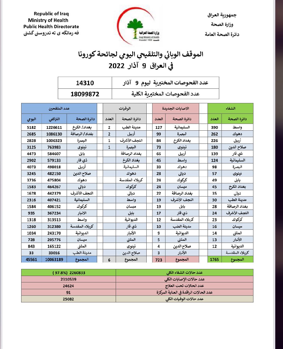 وقالت الوزارة في بيان ، إنها سجلت "723 إصابة جديدة، مقابل تماثل 1765 حالة جديدة للشفاء، و6 حالات وفاة بالفيروس".