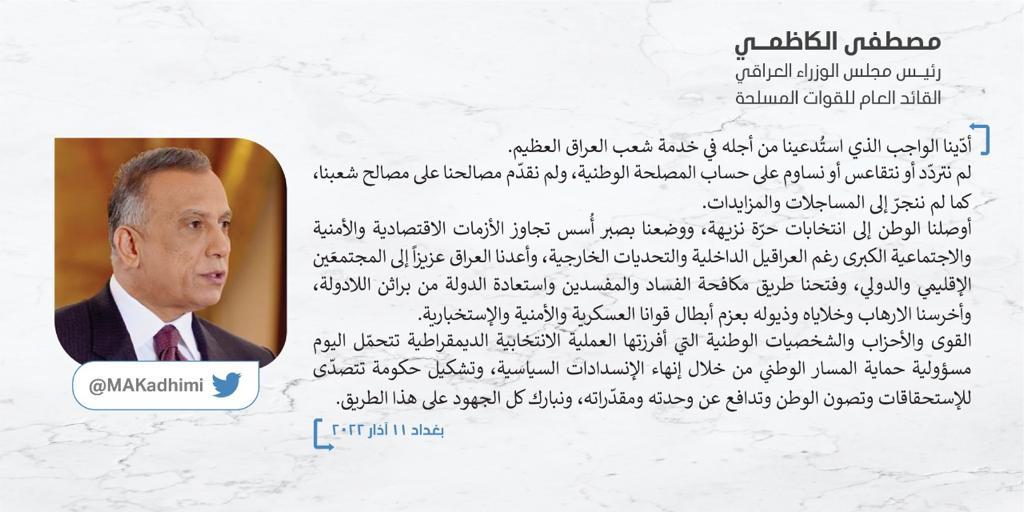 وقال الكاظمي في تغريدة "أدينا الواجب الذي اُستدعينا من اجله في خدمة شعب العراق العظيم".
