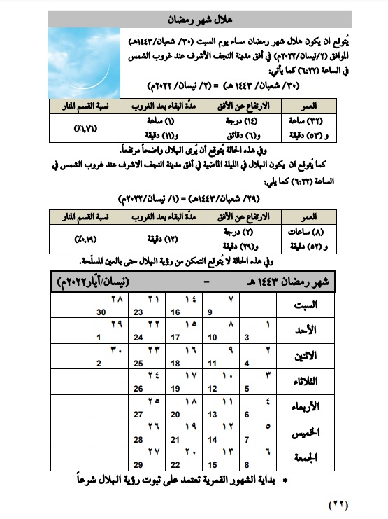 يتوقع ان يكون هلال شهر رمضان مساء يوم السبت (30/شعبان/1443هـ) الموافق (2/نيسان/2022) في أفق مدينة النجف الأشرف عند غروب الشمس في الساعة (06:22) كما يأتي ( (30/ شعبان/1443هـ) = (2/ نيسان/2022).