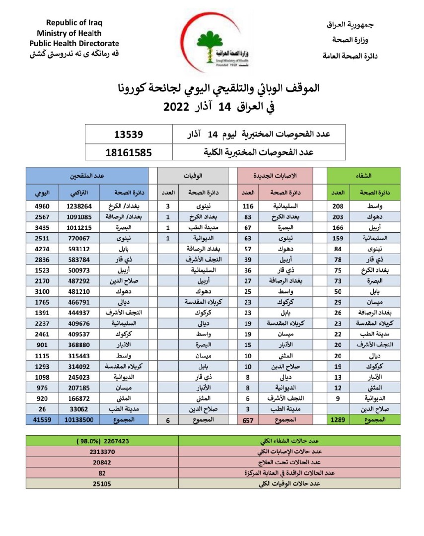 وقالت الوزارة في بيان ، إنها سجلت "657 إصابة جديدة، مقابل تماثل 1289 حالة للشفاء، و 6 حالات وفاة بالفيروس".