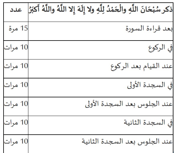 وهي عبارة عن أربع ركعات (ركعتان ركعتان) فيها يتكرّر ذكر التسبيحات الأربعة «سُبْحَانَ اللَّهِ وَالْحَمْدُ لِلَّهِ وَلا إِلَهَ إِلا اللَّهُ وَاللَّهُ أَكبرُ» 300 مرة. وأفضل أوقات أدائها نهار الجمعة وفي شهر رمضان.