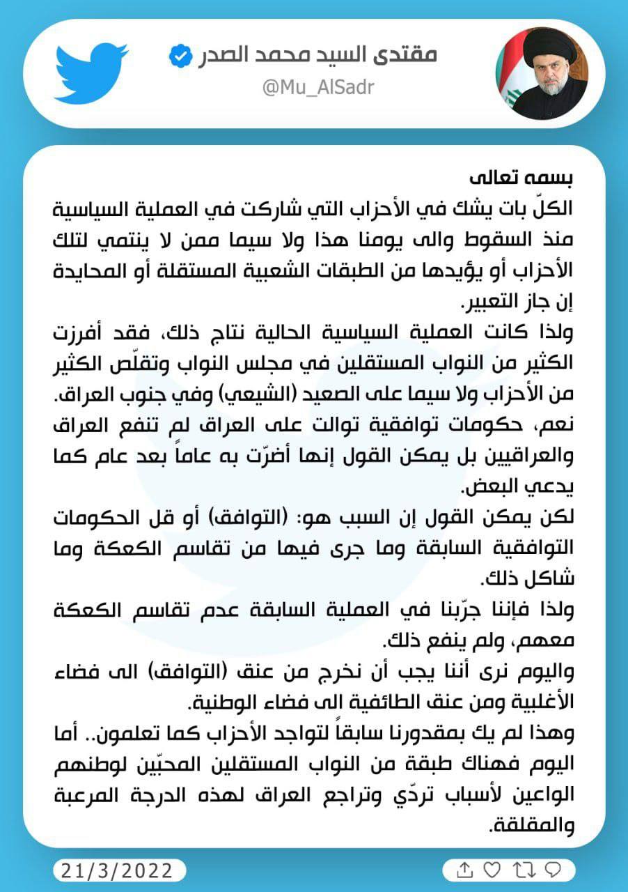 وقال الصدر في تغريدة على تويتر إن "الكل بات يشك في الأحزاب التي شاركت بالعملية السياسية منذ السقوط والى يومنا هذا ولا سيما ممن لا ينتمي لتلك الأحزاب أو يؤيدها من الطبقات الشعبية المستقلة أو المحايدة إن جاز التعبير، ولذا كانت العملية السياسية الحالية نتاج ذلك، فقد أفرزت الكثير من النواب المستقلين في مجلس النواب وتقلص الكثير من الأحزاب ولا سيما على الصعيد (الشيعي) وفي جنوب العراق"، مردفا، " نعم، حكومات توافقية توالت على العراق لم تنفع العراق والعراقيين بل يمكن القول إنها أضرت به عاما بعد عام كما يدعي البعض لكن يمكن القول إن السبب هو: (التوافق) أو قل الحكومات التوافقية السابقة وما جرى فيها من تقاسم الكعكة وما شاكل ذلك".