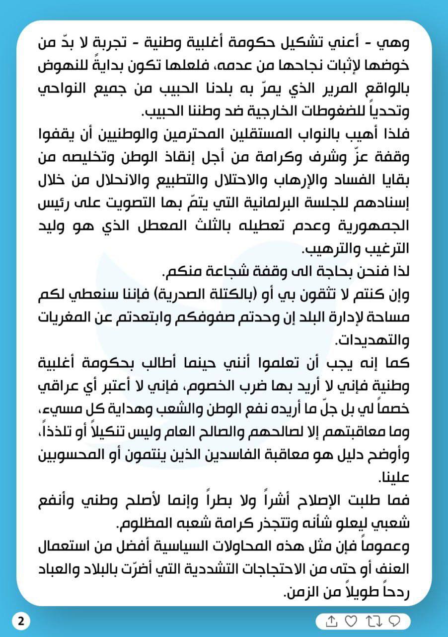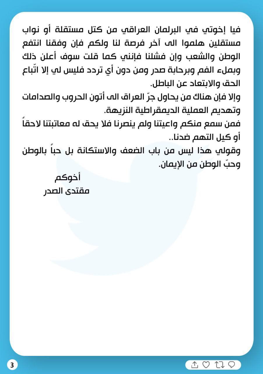 وختم زعيم التيار الصدري، "فيا إخوتي في البرلمان العراقي من كتل مستقلة أو نواب مستقلين هلموا الى آخر فرصة لنا ولكم فإن وفقنا انتفع الوطن والشعب وإن فشلنا فإنني كما قلت سوف أعلن ذلك وبملء الفم وبرحابة صدر ومن دون أي تردد فليس لي إلا اتباع الحق والابتعاد عن الباطل وإلا فإن هناك من يحاول جر العراق الى أتون الحروب والصدامات وتهديم العملية الديمقراطية النزيهة. فمن سمع منكم واعيتنا ولم ينصرنا فلا يحق له معاتبتنا لاحقا أو كيل التهم ضدنا.. وقولي هذا ليس من باب الضعف والاستكانة بل حبة بالوطن وحب الوطن من الإيمان".